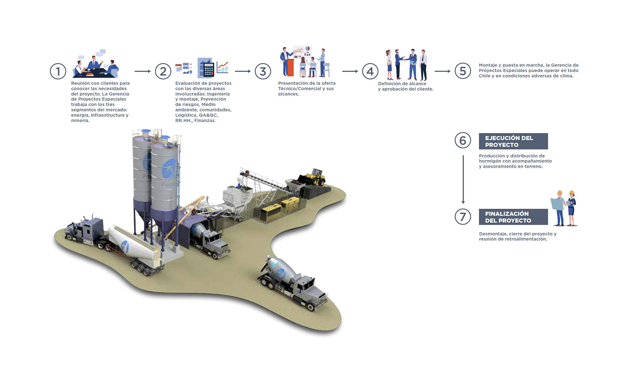 La gerencia de Proyectos Especiales es una unidad de gestión enfocada en aquellos proyectos en donde la adaptabilidad y flexibilidad son la base de un servicio con grandes procesos constructivos. Además, se busca solucionar problemas en base a la experiencia y trayectoria que nos respalda, adaptándonos así a las necesidades que vayan surgiendo en cada proyecto. Tenemos la capacidad técnica y logística para instalar plantas de hormigón en el lugar donde se están desarrollando los proyectos. Nuestra tecnología nos permite una producción flexible, que se adapta a los más complejos requerimientos del mercado. En la actualidad, contamos con plantas de producción de hormigón desde Arica hasta Punta Arenas.